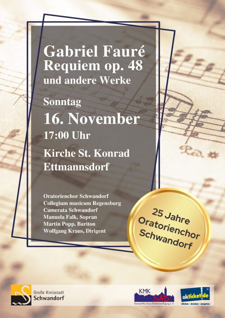Am 16. November 2025 (Volkstrauertag) um 17.00 Uhr – dieses Mal in der Kirche St. Konrad, Ettmannsdorf – findet unser Jubiläumskonzert u.a. mit dem bekannten Requiem op.48 von Gabriel Fauré, zusammen mit dem Chor des Collegium musicum Regensburg und unter der Leitung von Wolfgang Kraus statt. Veranstalter dieser Aufführung ist das Amt für Kultur und Tourismus Schwandorf.